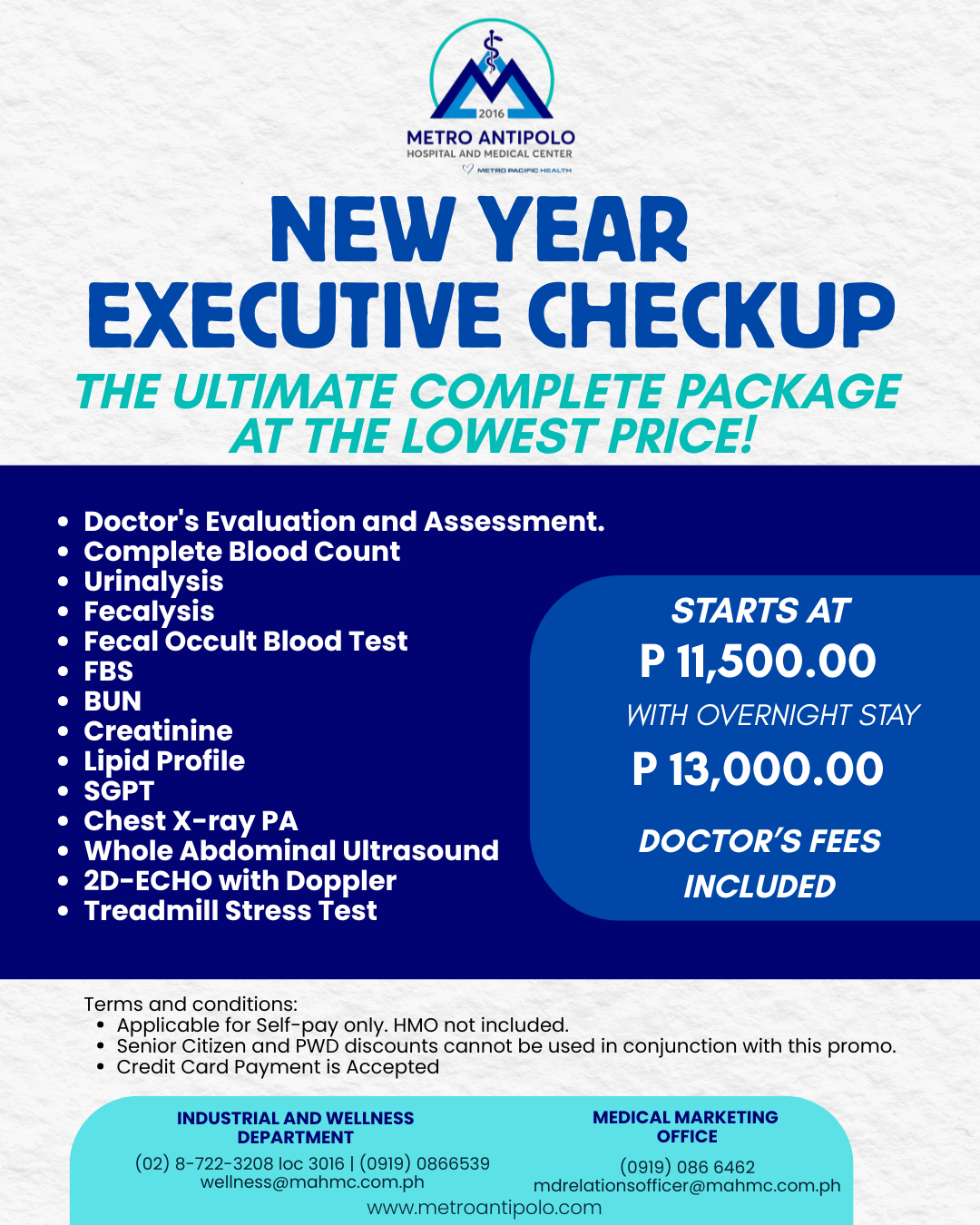 After all the holiday parties, binges, and stress, it's time to check on your family's health. Avail of the NEW YEAR EXECUTIVE CHECKUP PACKAGE for yourself or your loved ones now! Simply register through the link below.